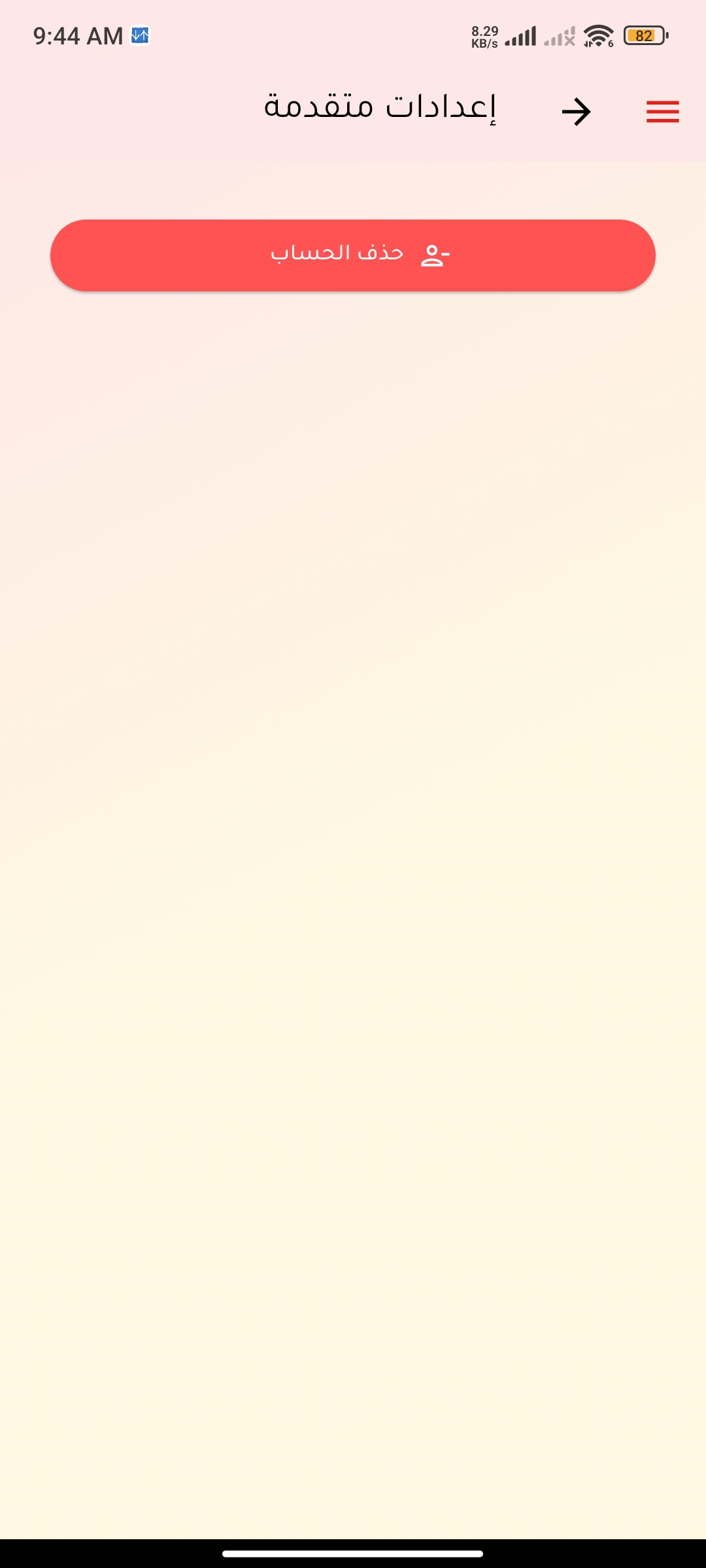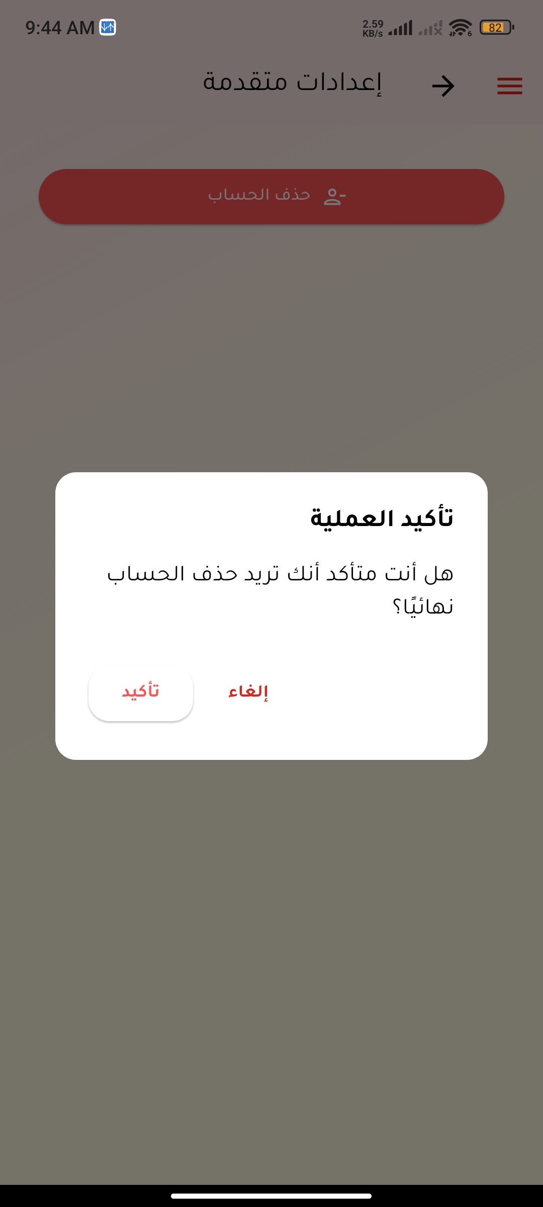 2- قم بالنقر على زر حذف الحساب في شاشة الإعدادات المتقدمة